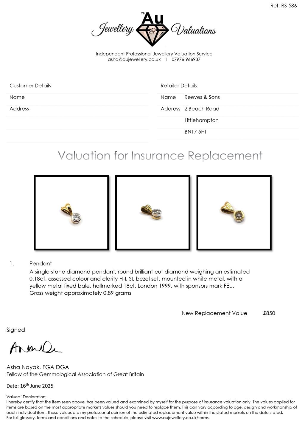 18ct single diamond pendant with round brilliant cut diamond est weight 0.18ct