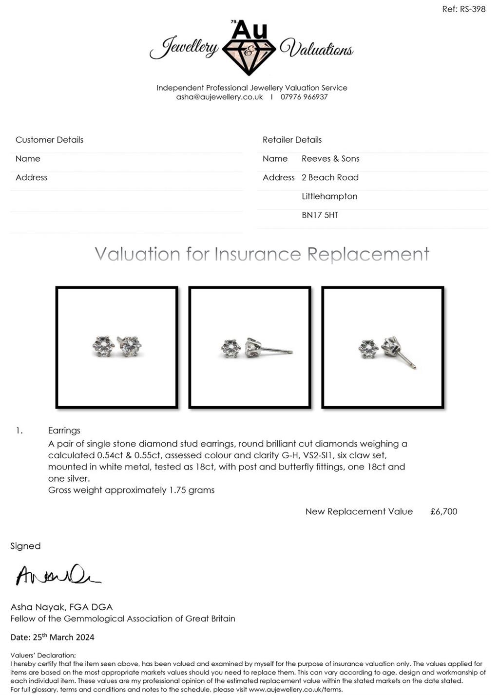 18ct white gold 1.09 carat single stone diamond stud earrings,