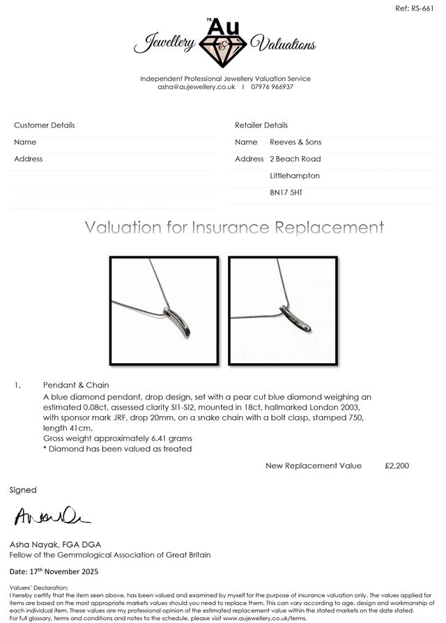 pendant has a pear cut blue diamond weighing an est 0.08ct