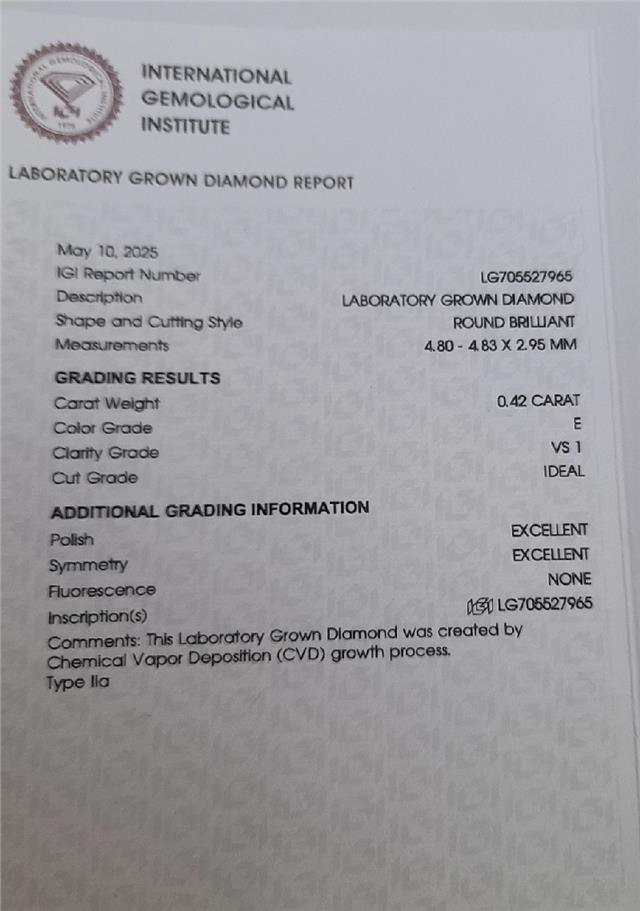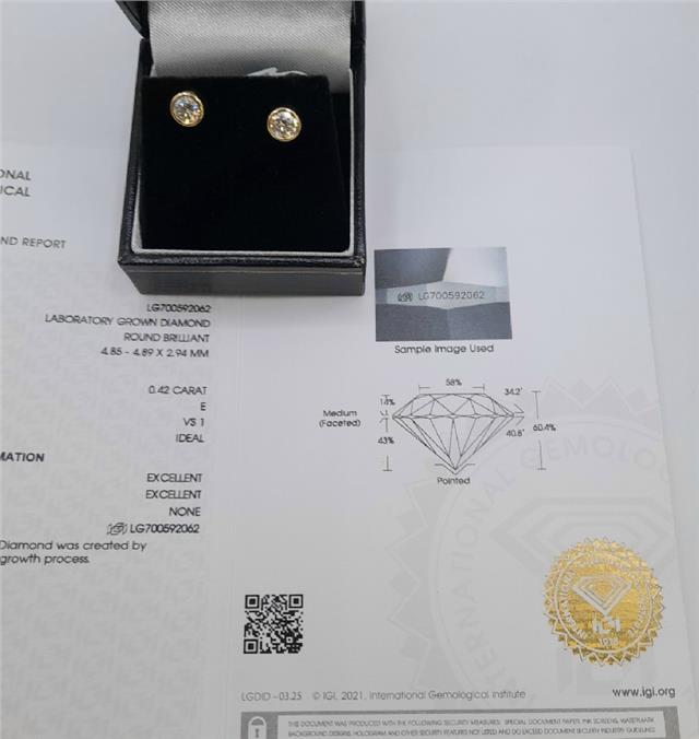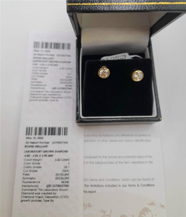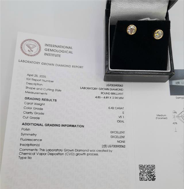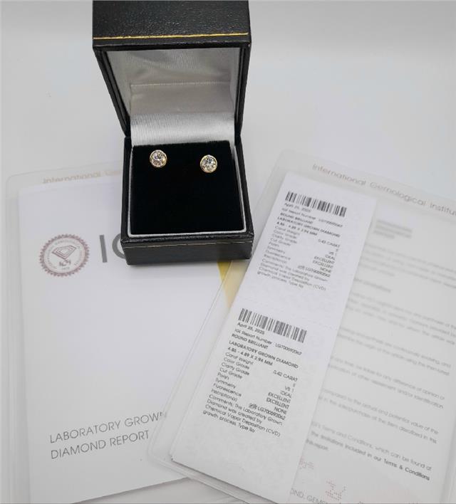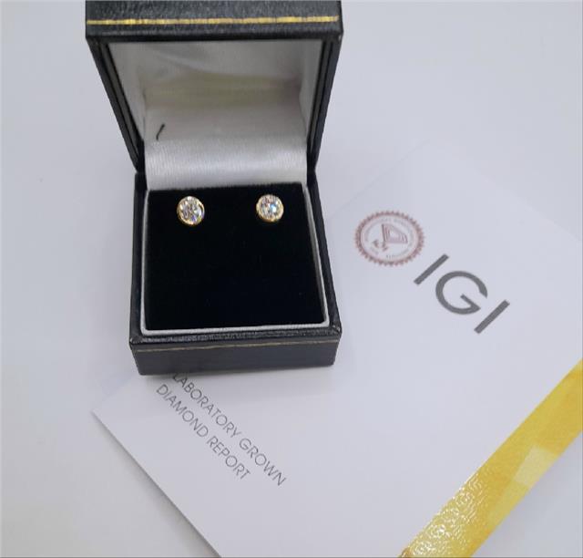 18ct Yellow Gold 0.84ct lab diamond earrings, Colour E, VS1, IGI cert