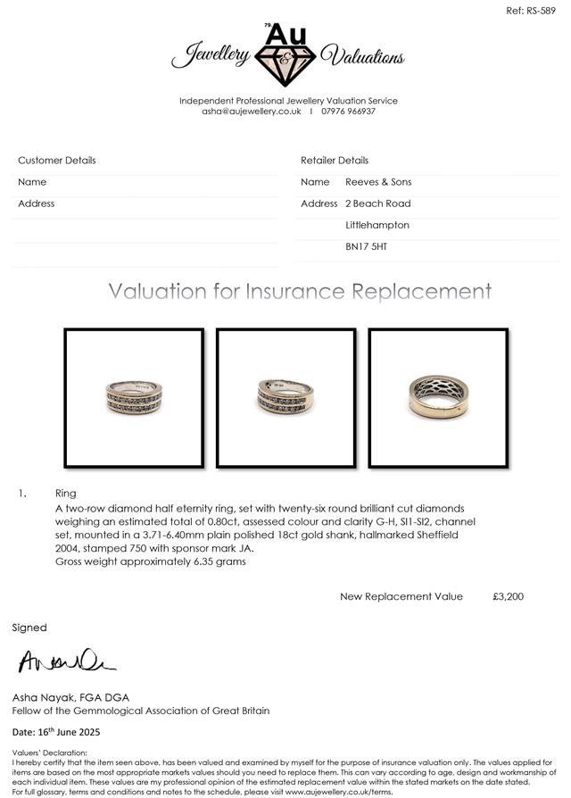 colour G-H, clarity SI1- SI2, diamonds are channel set.