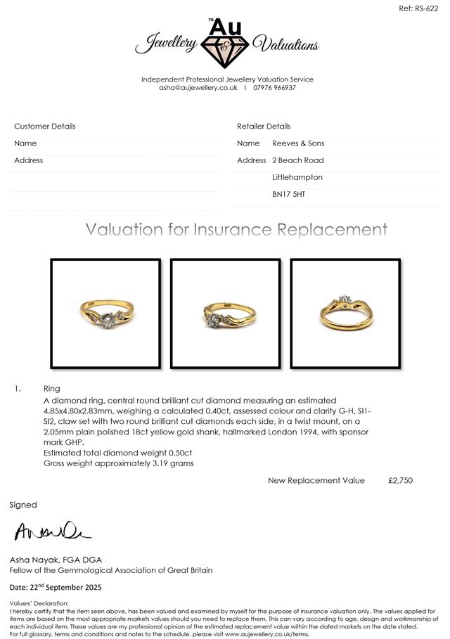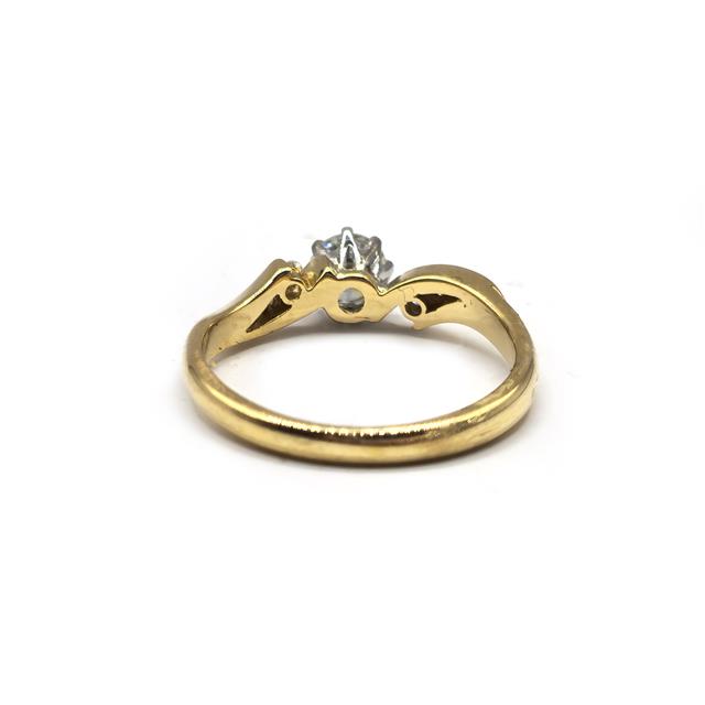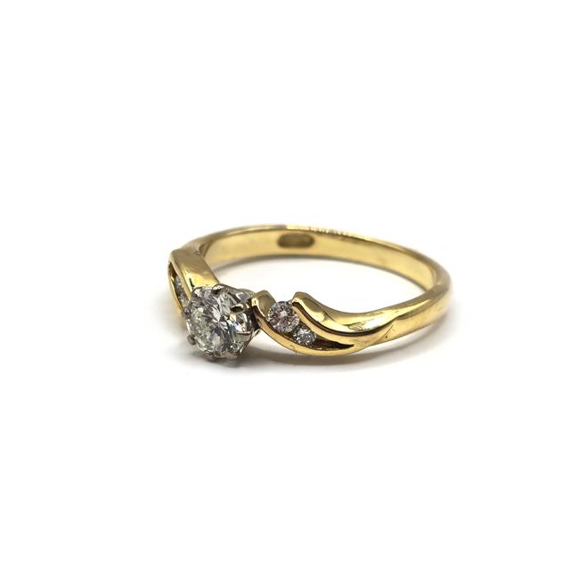 18ct yellow gold diamond ring, a single central diamond weighing 0.40ct, assessed color G-H, clarity SI1-SI2 in a claw setting, with two round brilliant cut diamonds each side in a twist mount.