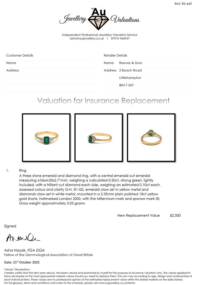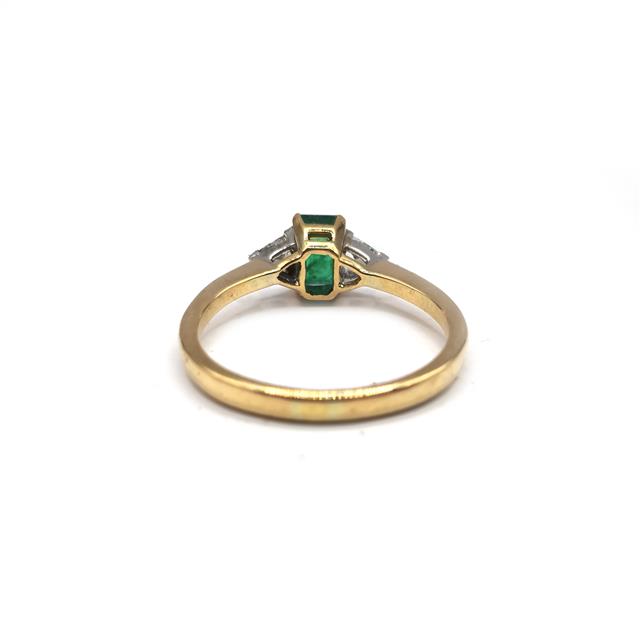 18ct yellow gold ring with a centre emerald cut emerald and 2 trilliant cut diamonds 1 each side.
