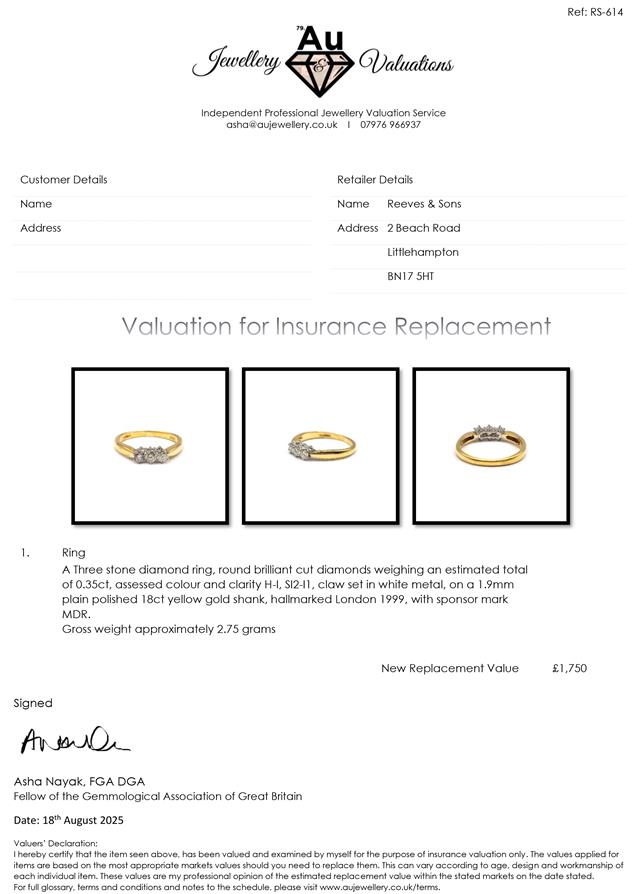 3 round brilliant cut diamonds weighing an est total of 0.35ct,