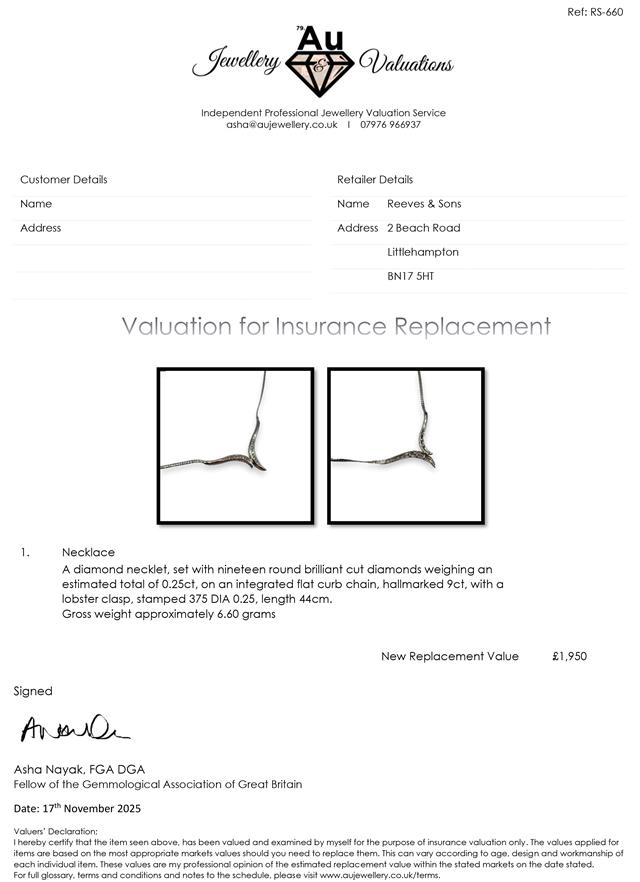 9ct white gold diamond necklace set with 19 round brilliant cut diamonds weighing an est of 0.25ct