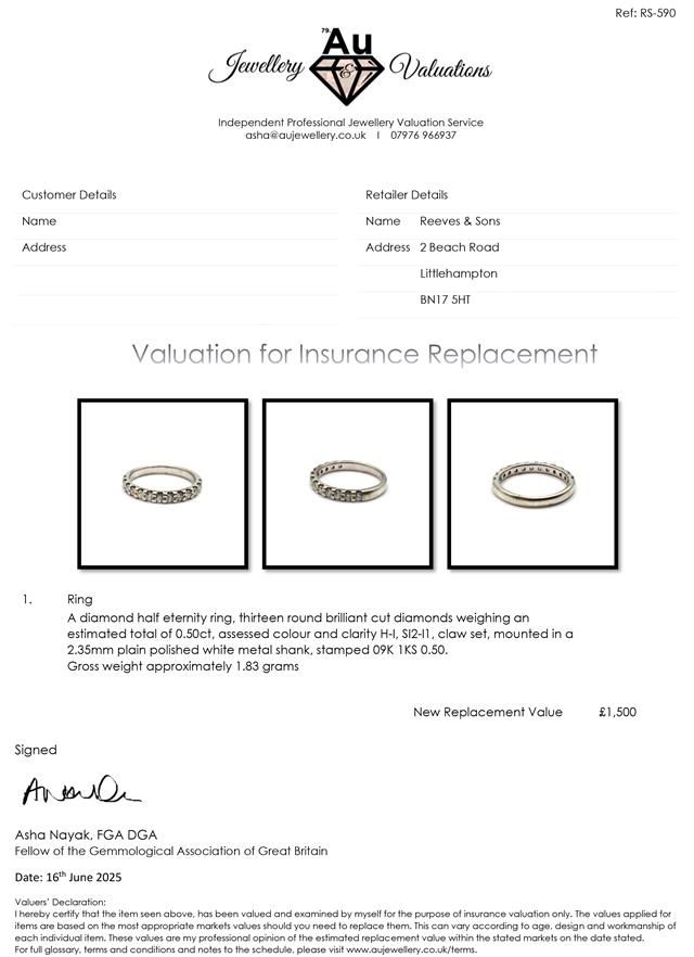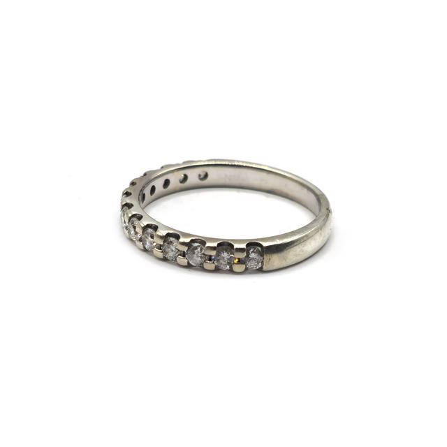 9ct white gold ring half eternity ring set with 13 round brillinat cut diamonds weighing a total est crt of 0.50.