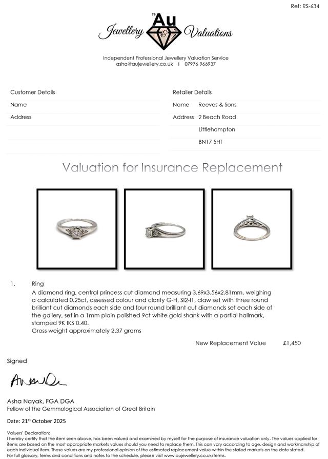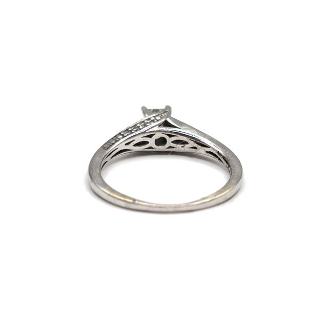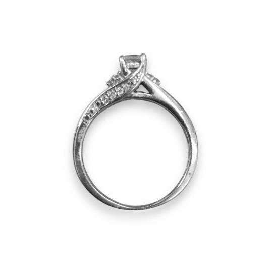 9ct white gold ring with a central princess cut diamond weighing a calculated 0.25ct.