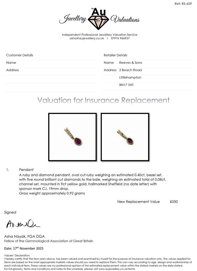 9ct ruby and diamond pendant in yellow gold.