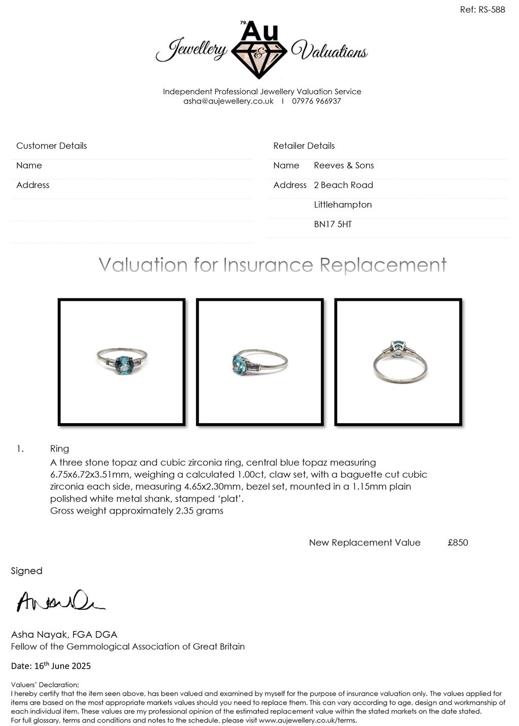 central blue topaz weight 1.00ct with baguette cut cubic zirconia each side